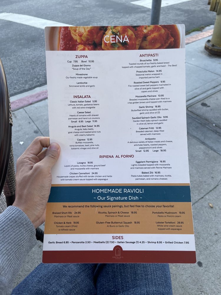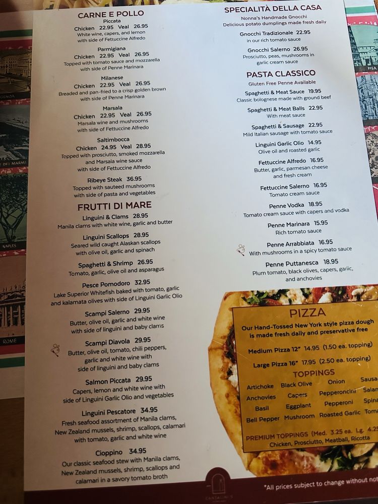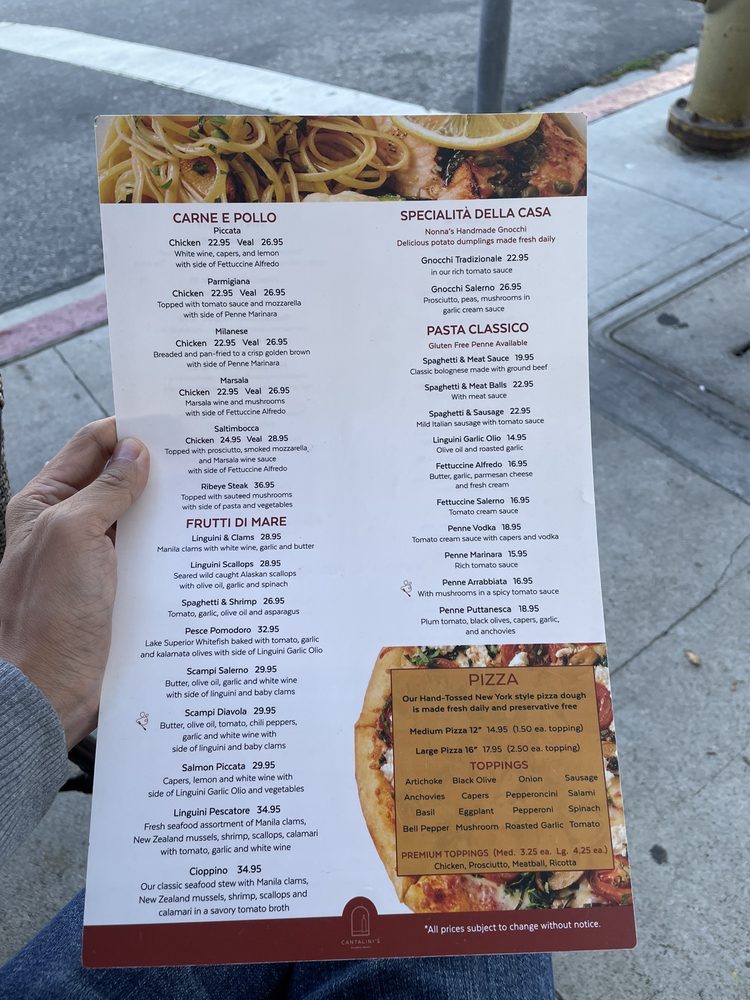 Introducing the menu at Cantalini’s Salerno Beach Restaurant: located in Playa Del Rey, CA, this charming Italian spot boasts a variety of dishes including antipasti like bruschetta, calamari fritti, and caprese. Their pizza selection offers classics like pepperoni and margherita, as well as unique options like Grandpa's Garden and Bianco. For lunch, they offer a special with soup and salad for a reasonable price. Customers rave about the delicious dishes, intimate setting, and helpful waitstaff. The restaurant is women-owned and provides a cozy atmosphere with Italian music playing. With options for vegan and limited vegetarian diets, Cantalini’s is an all-around winner for those looking for a taste of Italy by the beach.